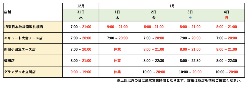 各店営業時間に関しましては下記をご確認くださいませ。 ※12月30日(火)まで、および1月5日(月)以降は通常営業時間となりますので、各店舗情報をご覧ください。